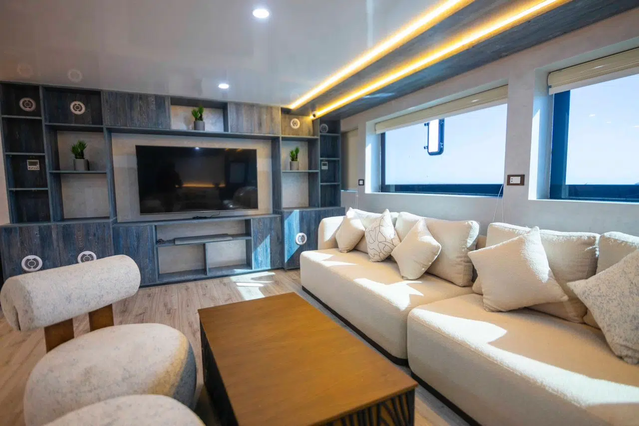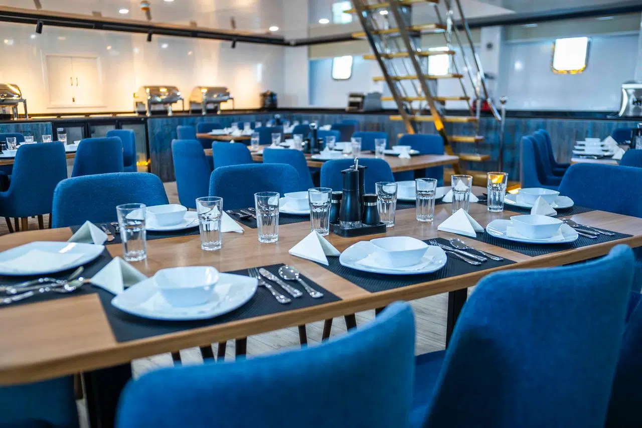 Szef kuchni serwuje swoim gościom pyszne i świeże jedzenie bazujące na rybach, warzywach i owocach morza. W cenie jest całkowite wyżywienie – śniadania, obiady, kolacje, desery oraz napoje bezalkoholowe. Możliwa jest opcja wyżywienia wegetariańskiego lub wegańskiego. Załoga łodzi jest wyszkolona do organizowania safari kitesurfingowego oraz nurkowego i jest do dyspozycji swoich gości.