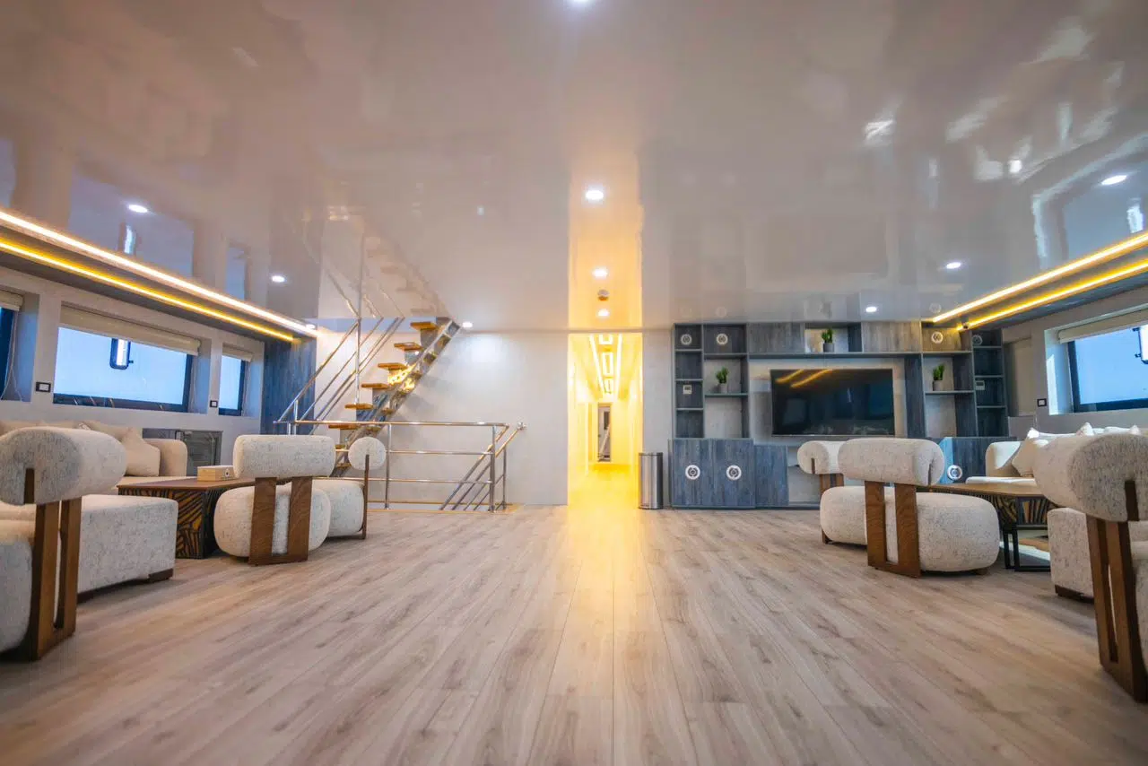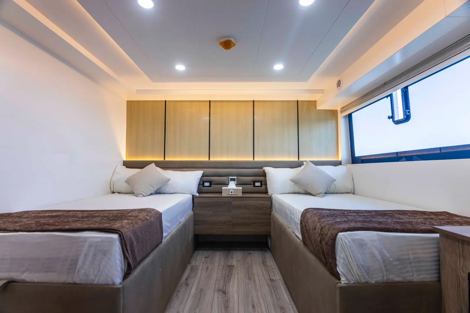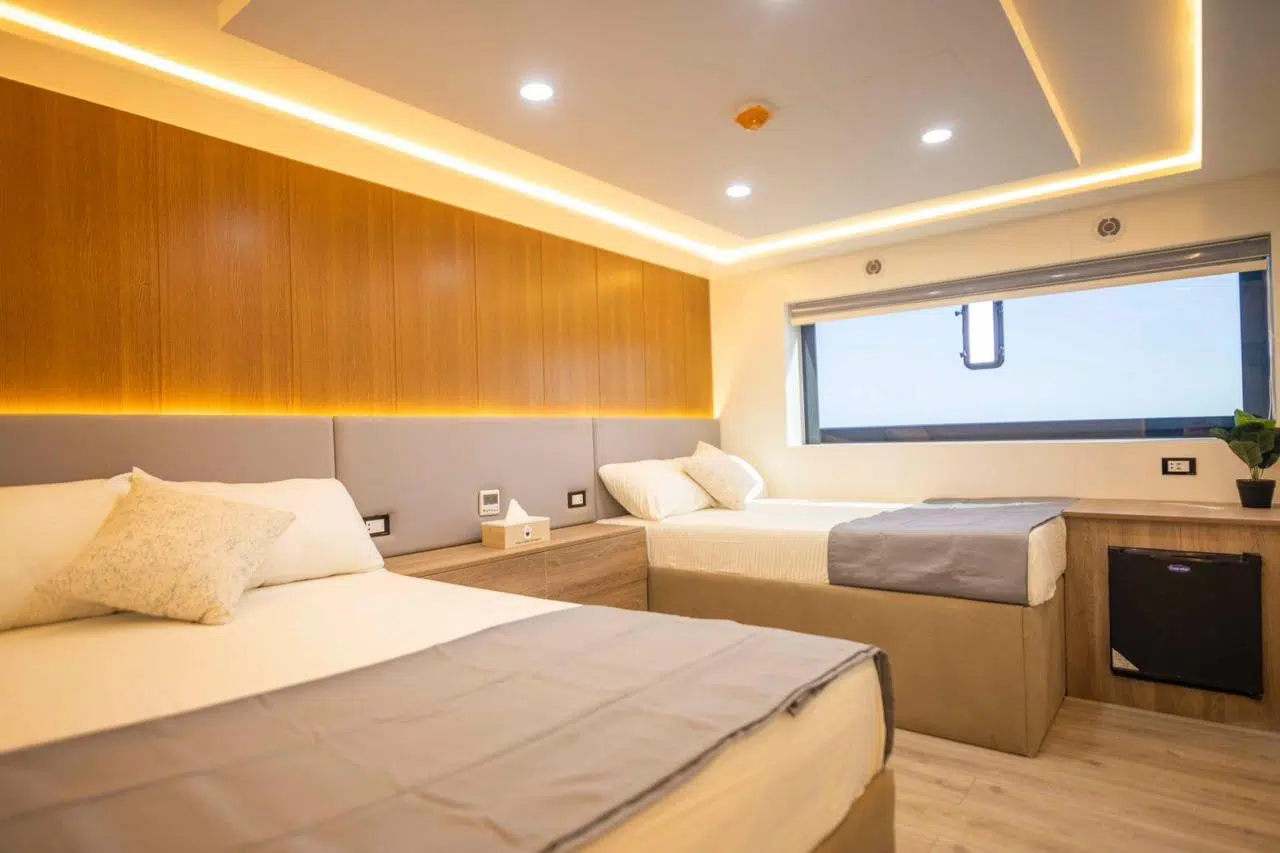 Na najwyższym pokładzie znajduje się 2 kajuty Master, na górnym pokładzie mamy 2 kajuty Master oraz 6 kajut z pojedynczymi łóżkami, środkowy pokład to 4 kajuty z pojedynczymi łóżkami, a na dolnym pokładzie znajdziemy 2 kabiny z podwójnym łóżkiem oraz 1 kabinę z dwoma łóżkami pojedynczymi.